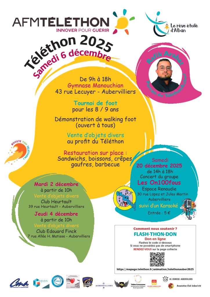 Le Téléthon 2025 a lieu cette année le samedi 6 décembre au gymnase Manouchian à Aubervilliers. Au programme : tournoi de foot, vente d’objets, buvette… Organisé par l’association Le Rêve Etoilé d’Alban.