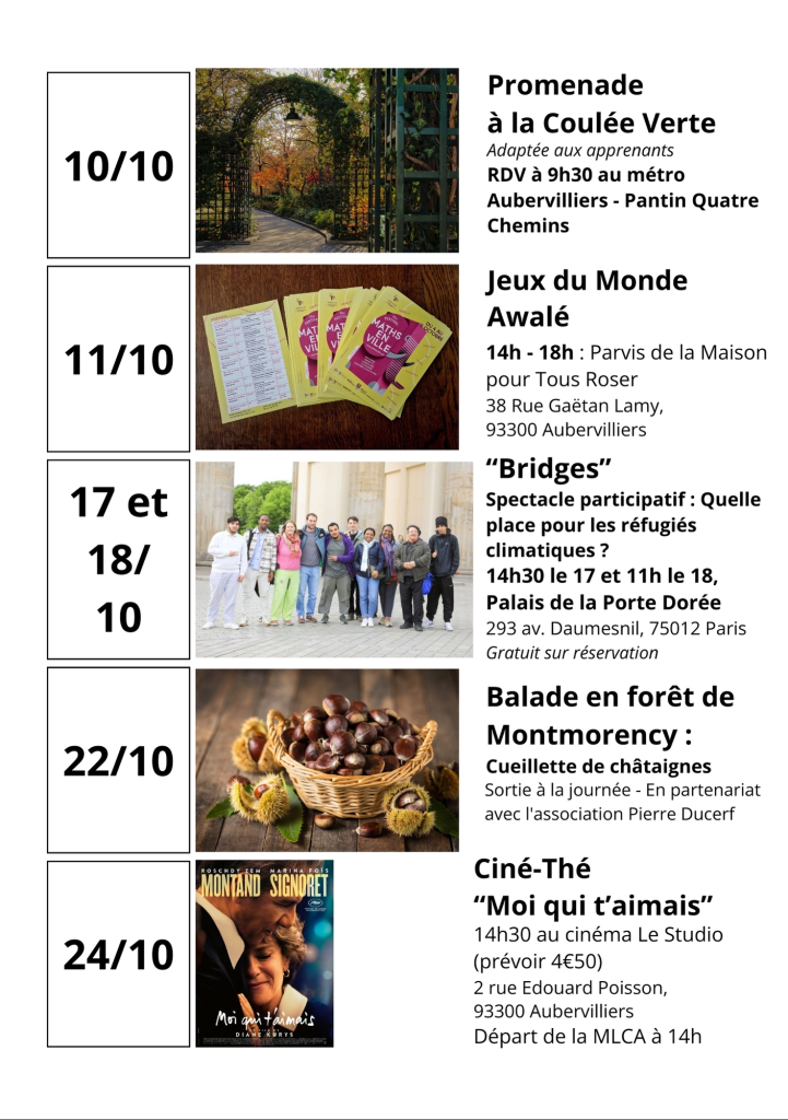 La Maison des Langues et des Cultures d’Aubervilliers vous invite à une promenade le long de la Coulée Verte, le vendredi 10 octobre. Rendez-vous à 9h30 au métro 7 à 4 chemins.