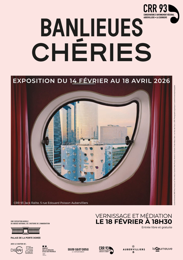 Le CRR 93 Jack Ralite a le plaisir de vous inviter au vernissage de l’exposition itinérante Banlieues Chéries du Palais de la Porte Dorée, accueillie au conservatoire d’Aubervilliers – La Courneuve du 14 février au 18 avril 2026.