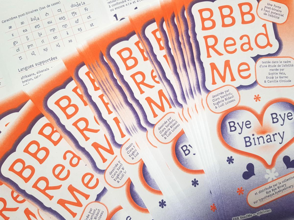 Depuis 2018, la collective Bye Bye Binary travaille à la création et à la diffusion de fontes post-binaires. Celles-ci permettent une écriture inclusive du français reposant sur un ensemble de ligatures et de caractères alternatifs dessinés pour cet usage et permettant une débinarisation graphique de la langue. La fonte BBB ReadMe a été dessinée pour tenter de répondre aux besoins spécifiques des personnes ayant un trouble cognitif impactant la lecture (troubles dys, TDA/H, TSA) en étant testée auprès des personnes concernées. L’étude s’est déroulée par le biais d’entretiens semi-directifs auprès d’un panel mixte en termes d’âge comme de genre. Ceux-ci ont permis de transmettre un ensemble de retours et recommandations aux dessinatrices de la fonte qui ont apporté les corrections nécessaires. À l’occasion de sa sortie et de sa diffusion sur la typothèque de Bye Bye Binary, H·Alix Sanyas invite sa collective à venir présenter et célébrer la fonte à la Station – Gare des Mines (Sud). La conférence sera suivie de la projection de son court-métrage JE VEUX YN PRÉSIDOL tourné à la Station (Nord) en 2023 puis d’un DJ set réunissant les BBBaes Marouchka Payen & Félixe Kazi-Tani.
