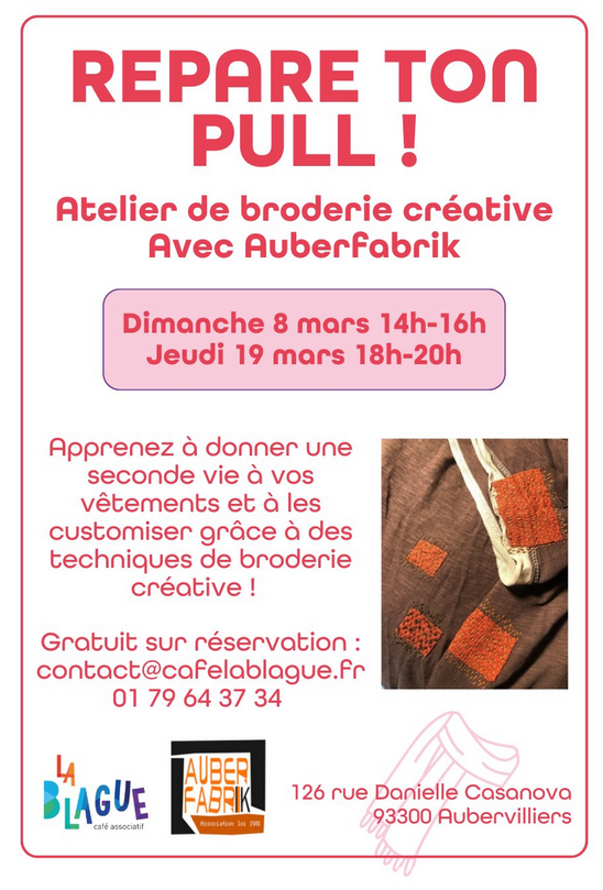 Auberfabrik et le café La Blague vous propose un atelier « Répare ton pull » le jeudi 19 mars au 126 rue Danielle Casanova.